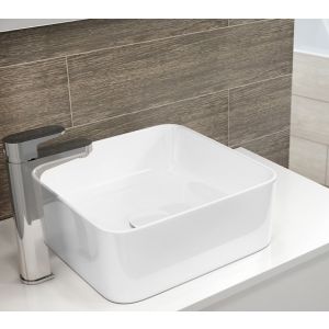 • Kockasti keramički lavabo bele boje visećeg tipa.